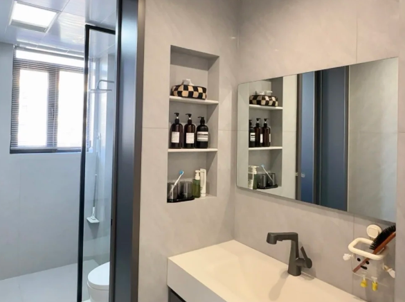 卫生间的空间比拟多,在墙壁的空间上去作念壁龛收纳,