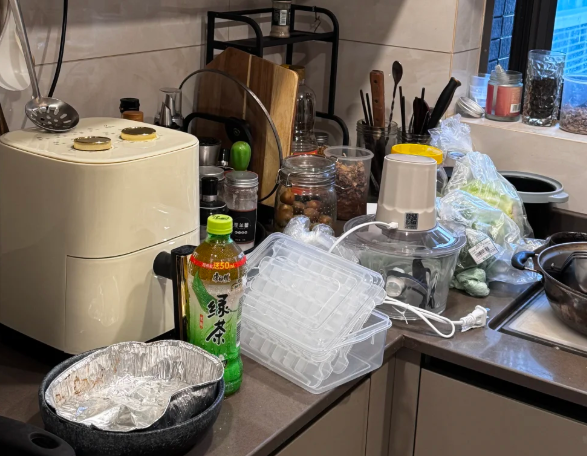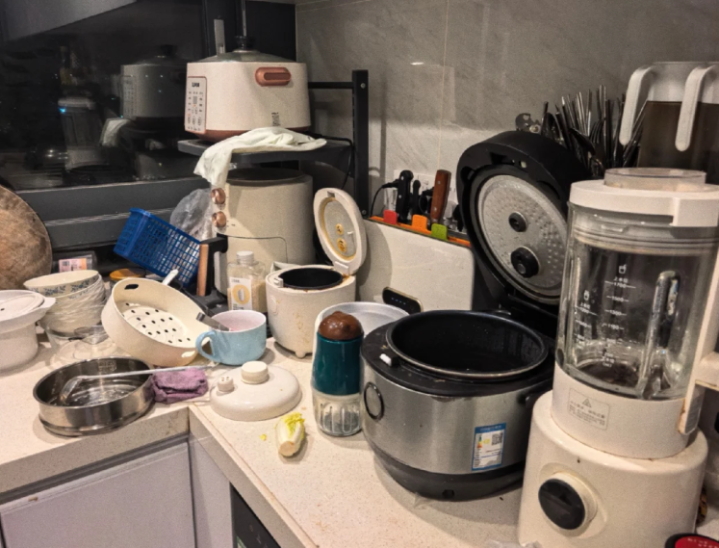 比如,多样食材、调料、锅具、家电等等,这些东西堆积在台面上,看着乱糟糟。