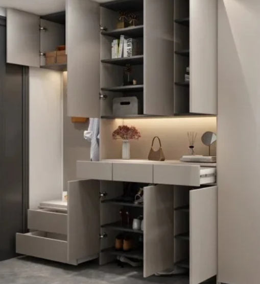 中间预留出一个怒放格,用来放钥匙、包包等等很便捷,还可以作念一个智能感应灯带加多氛围;