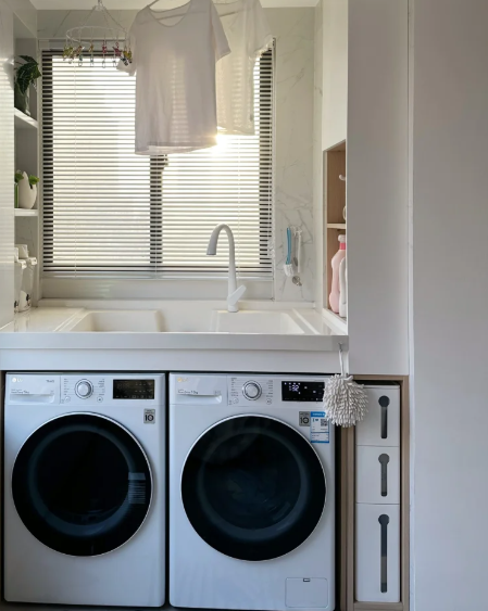 阳台的侧面去作念顶天赶紧的鞋柜,装上烘干机和洗衣机,加多使用效劳,让阳台合理愚弄上。