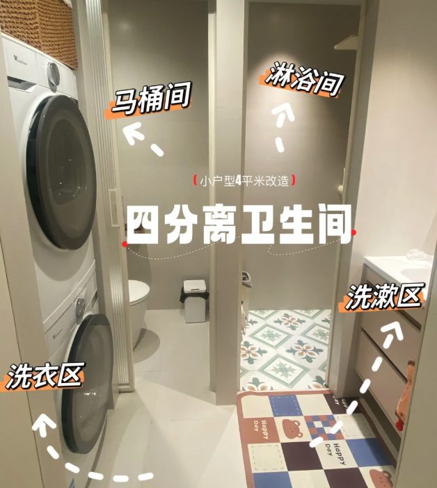 比如,你可以在卫生间中作念好“四离别”的神气,把洗手台径直外移,内部的入厕区、淋浴区全部都用窒碍给分开。