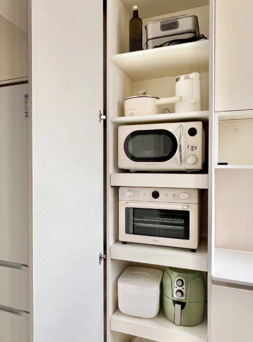 这内部作念好分格,抽拉的缠绵,放在台面上的小电器都能放入到收纳柜中,比如烤箱、空气炸锅、微波炉、电饭煲等等,不占场合。