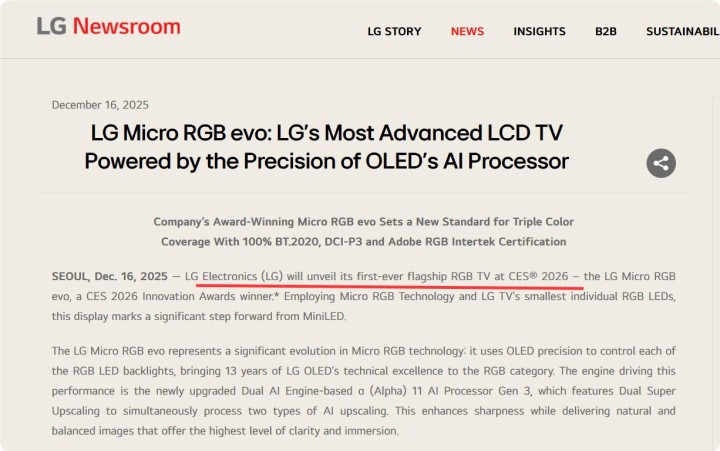 从当今已知的坊间爆料来看,三星和LG均将在CES 2026时分展示自家的Micro RGB新品,三星强调RGB精度与AI料理的优化,LG则杰出OLED式精准限制与广色域的交融,两边各有千秋。