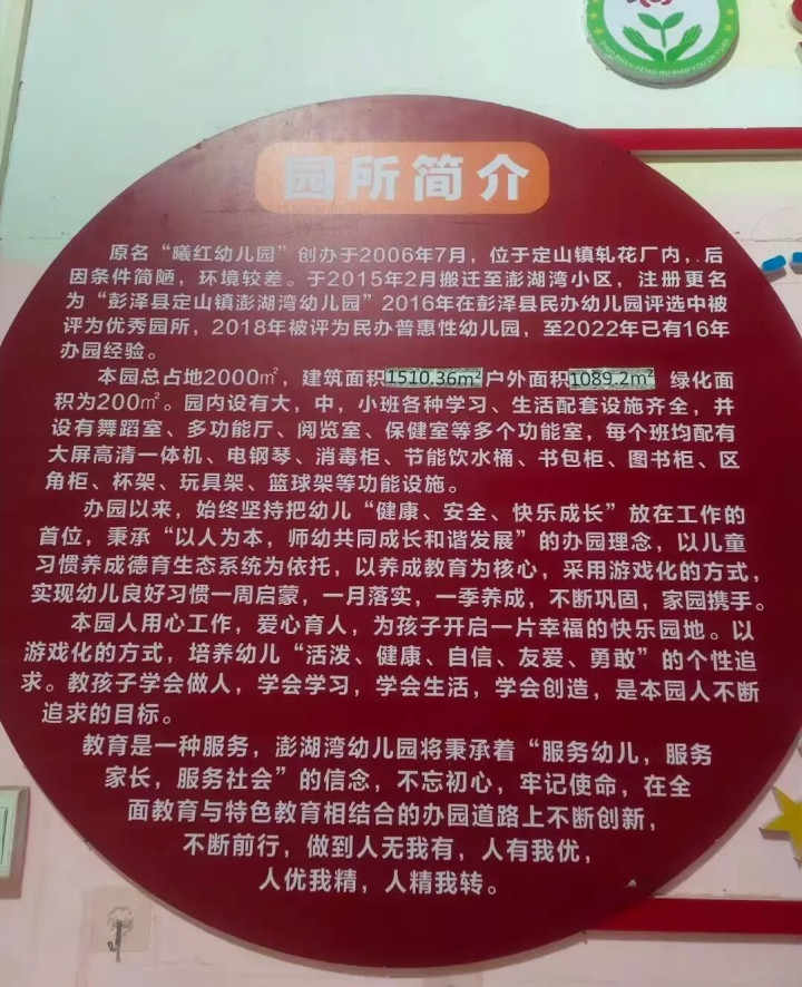 据了解,涉事幼儿园是彭泽县定山镇的澎湖湾幼儿园,这是一家民办幼儿园。网传幼儿园内张贴的一张简介涌现,澎湖湾幼儿园2015年搬到澎湖湾小区,总占地2000平日米,园内设有大、中、小班,2016年在县民办幼儿园评比中,被评为优秀园所,2018年被评为民办普惠性幼儿园。